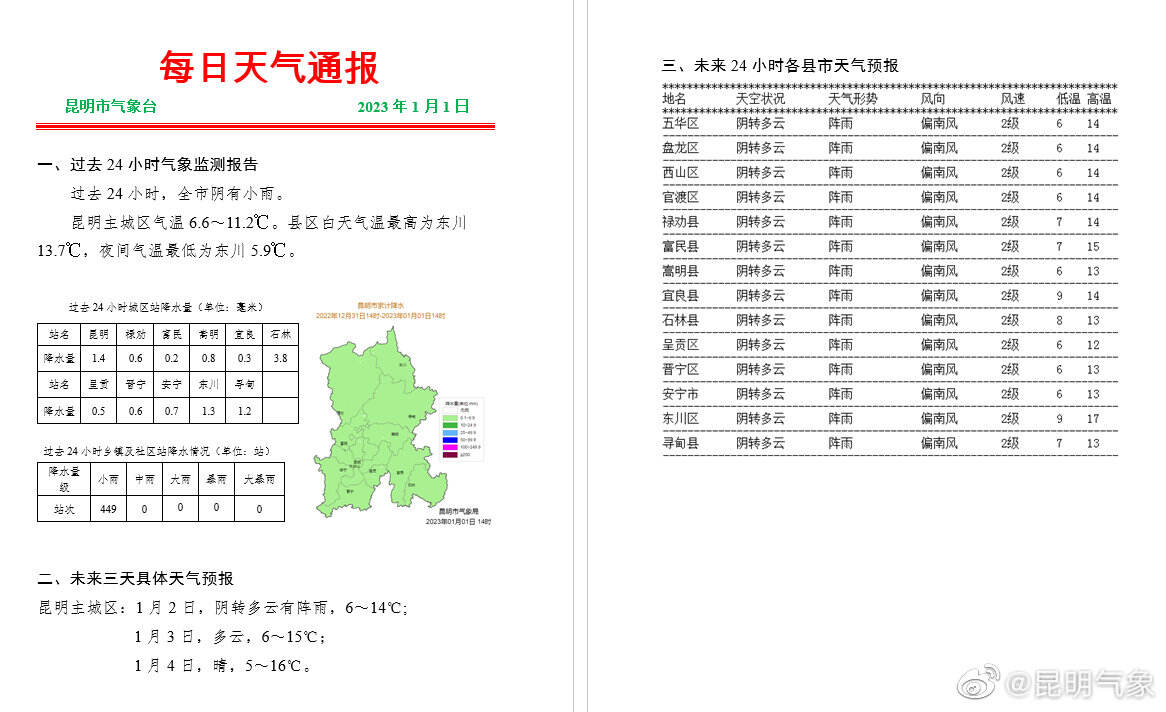 01月01日20时到01月02日20时:昭通北部高海拔地区阴有雨夹雪或小雪,怒江北部多云有阵雨,曲靖、昆明、玉溪、楚雄南部、普洱、临沧东部、西双版纳西部阵雨转多云,其它地区多云。
