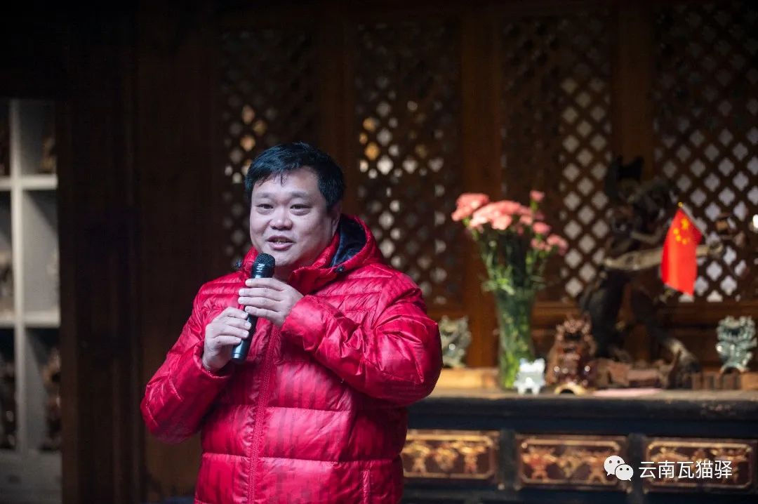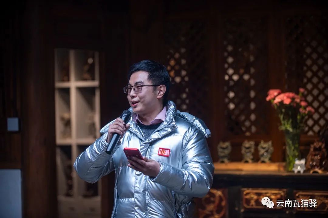 新年秀活动中,龙泉古镇文化研究院院长、瓦猫博物馆馆长洪海波致新年贺词并介绍瓦猫驿创新创意的运营理念。