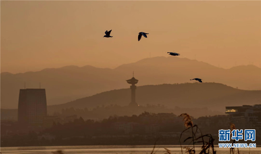 1月7日早晨,云南大理洱海月湿地公园,海鸥展翅。新华网发(嬴光万/摄)
