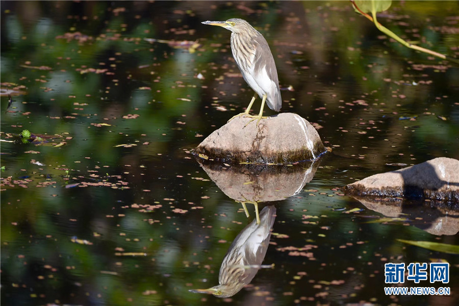 1月7日早晨,云南大理洱海月湿地公园,池鹭立于石上。新华网发(嬴光万/摄)
