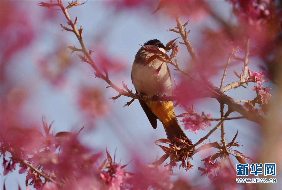 1月7日早晨,云南大理洱海月湿地公园,黄臀鹎掩于花中。新华网发(嬴光万/摄)