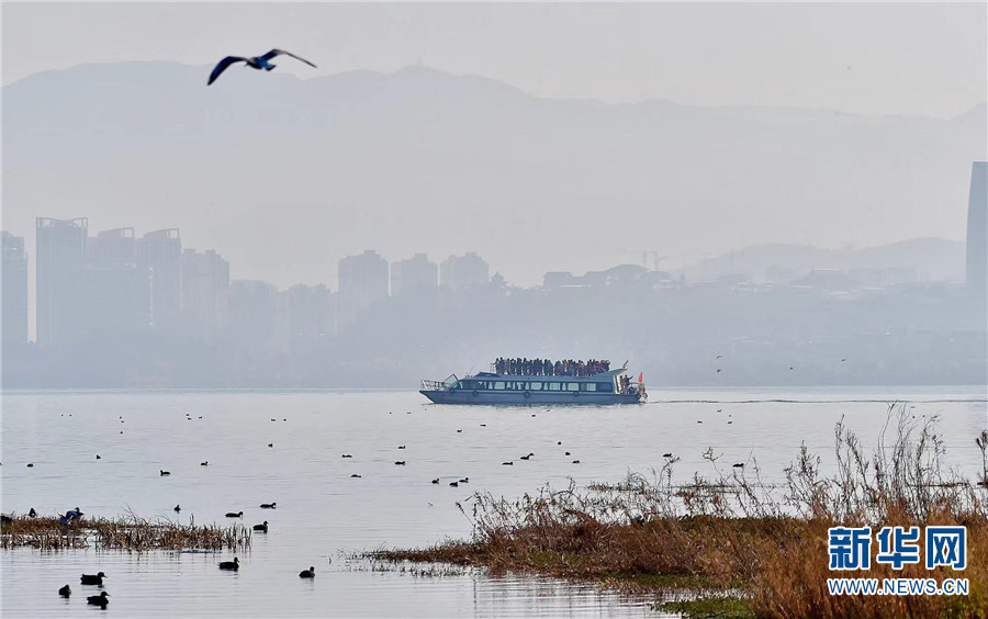1月7日早晨,云南大理洱海月湿地公园,鸟儿飞翔,游船驶入画中。新华网发(嬴光万/摄)