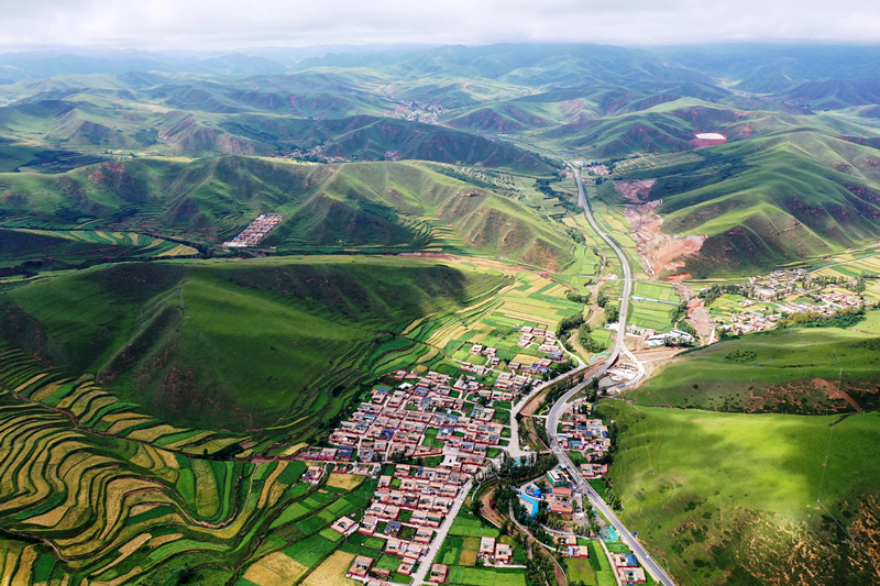 这是2020年8月12日拍摄的甘肃省甘南藏族自治州卓尼县阿子滩镇阿子滩村(无人机照片)。