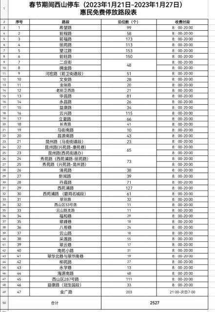 据了解,为进一步营造欢乐、祥和的春节气氛,方便广大市民走亲访友,昆明市西山区综合服务有限公司经上级主管部门同意及备案后,将于2023年1月21日至1月27日共7天法定节假日期间,对公司管辖的西山区46条国有路段的2527个“西山停车”泊位免费向市民开放泊位,免费开放时间自2023年1月21日0点起,恢复收费时间为2023年1月27日23点59分。