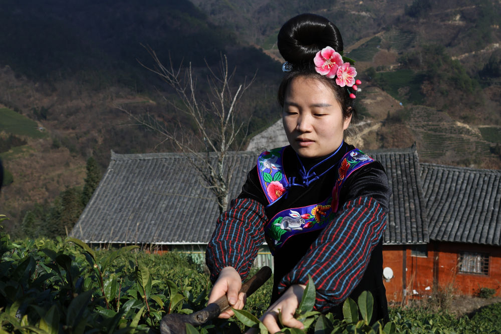 2023年1月10日,贵州省雷山县西江镇脚尧村村民毛花艳在管护茶园。新华社记者赵昭 摄