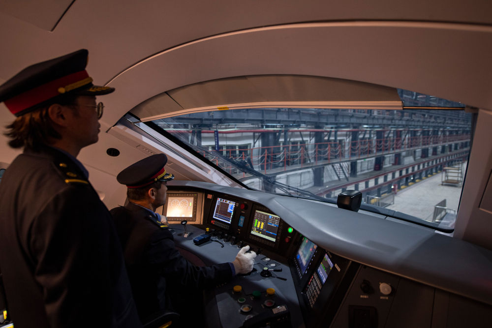 在拉萨机辆整备中心,黄起岗(右)和同事将动车组驶入停车位置(1月11日摄)。