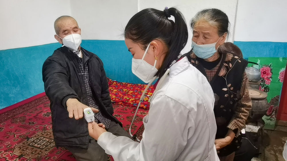 “今天感觉怎么样,有没有按时服药?”库瓦那木熟练地将指夹式脉搏血氧仪夹在老人手指上,帮他测量血氧饱和度,询问身体状况。
