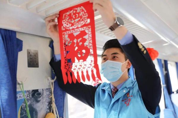 中国铁路昆明局集团有限公司青年志愿者在“慢火车”上贴窗花、送福字,更为车厢带来了浓郁的年味。