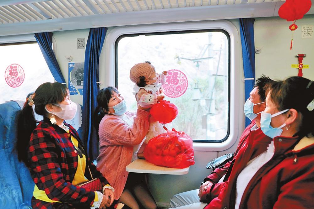车厢的座椅下、凳子旁、行李架上、小桌上都摆满一个个装满农产品的箩筐、麻袋,一些从昆明去元谋县城赶集的旅客,在车厢里走上一圈就能买到新鲜的特产。很多老乡在车上就能把自家种的蔬菜销售一大半,到了县城集市卖完蔬菜还能再置办一些年货。