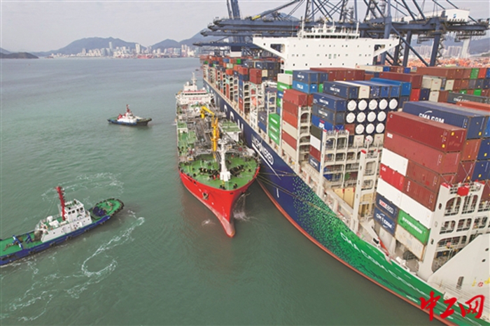 1月18日,在深圳盐田港海域,全球最大LNG运输加注船“海油石油301”通过“船对船”成功为全球最大型的双燃料动力集装箱船“达飞协和号”加注6000立方米LNG燃料。