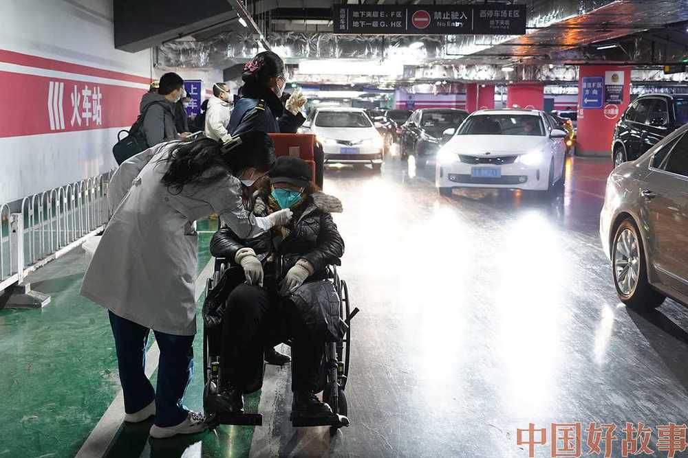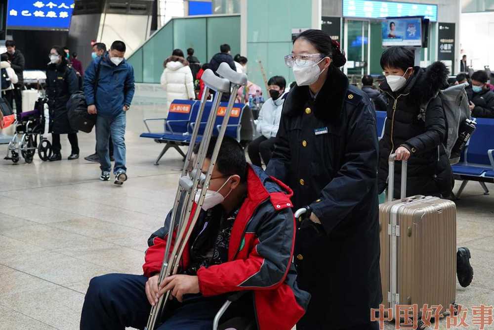 2023年1月10日,北京南站工作人员为旅客提供爱心服务。