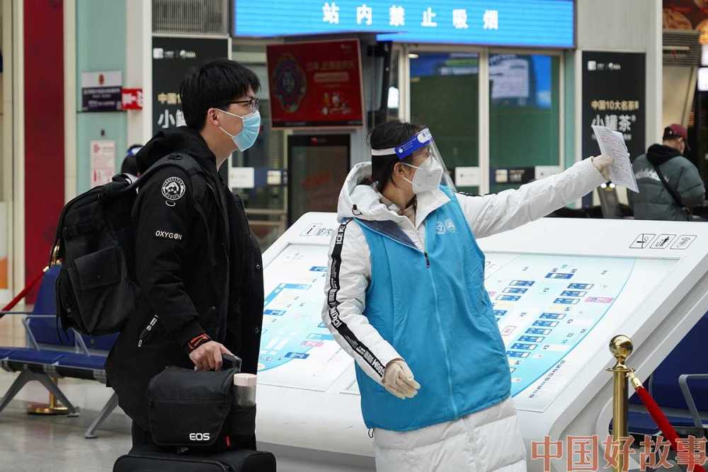 2023年1月10日,北京南站候车大厅内,志愿者引导旅客安全乘车。