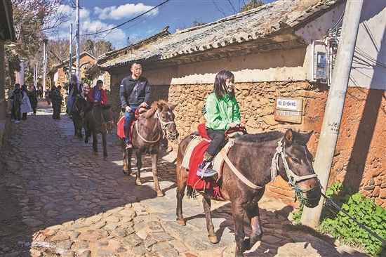 在云南省大理市凤阳邑村,游客骑着马在滇藏茶马古道上体验马帮生活。据马场负责人介绍,最近骑马的游客每天在60人次以上。 本报记者 赵黎浩 摄