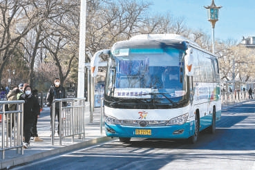 昨天下午,在前门旅游集散中心,延庆冰雪直通车载着游客发车前往延庆。