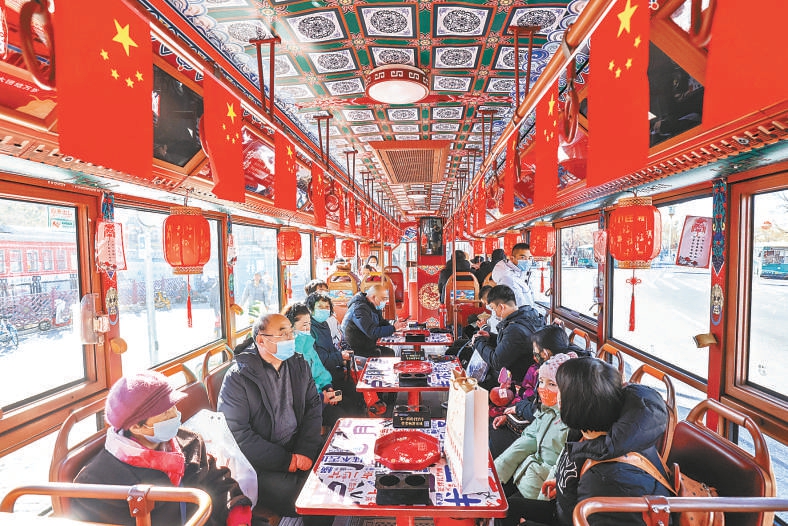 为迎接元宵节,仿古铛铛车内挂满红灯笼,车窗上还有灯谜,游客一边猜灯谜一边品尝北京小吃,节日气氛浓郁。北京日报记者 邓伟摄