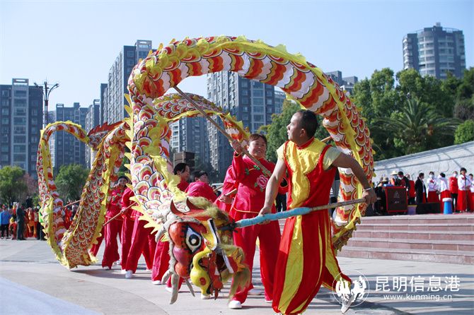 陆良县文化馆引导11个乡镇(街道)的11支代表队,沿爨文化广场起点-爨乡路-大鹏雕塑环岛-同乐大道-同乐广场,开展传统舞龙舞狮等民俗文化巡演。活水乡彝族刀叉舞表达了彝族人民丰收的喜悦心情;小百户镇彝族大三弦热情豪爽让人振奋;芳华镇、板桥镇的舞狮惟妙惟肖,赢得观众阵阵掌声;中枢街道的舞龙队锣鼓喧天,精彩纷呈。此外,旱船、半截马、广场舞、踩高跷等民俗文化巡演,也让观众看得如痴如醉。