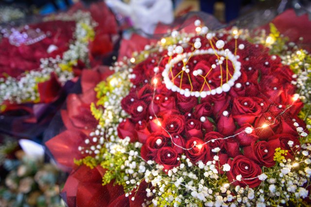 记者获悉,当天鲜切玫瑰一扎约50元起,洛神等品种则在70元/扎上下;包装的花束按照玫瑰花品种、数量不同,价格各有不同,小束粉色玫瑰58元、大束白玫瑰218元。花商介绍,省外发货量很大,临近情人节,许多游客、本地人来到花市采购,“花价已经处于冲高回落的阶段。”