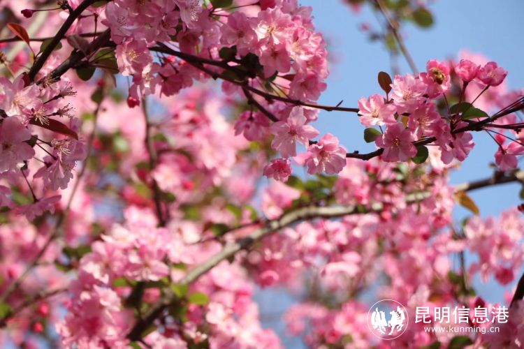 “圆通樱潮”位于昆明动物园中部,景观区南北宽约100米,东西长200余米。经过科学精细的管养和适宜气温的催化,今年云南樱花及垂丝海棠的植株生长强健。目前,园区内2000余株精心培育的樱花和海棠已进入初花期,一簇簇“粉团”挂于枝头,层层叠叠的粉色花朵与昆明的蓝天交相辉映,勾勒出昆明春天的绝美画卷。
