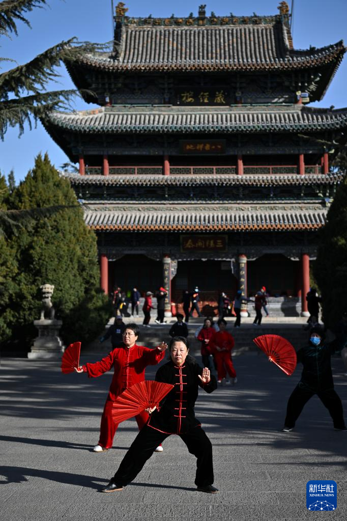 3月1日,在太原市迎泽区迎泽公园,市民练习太极扇。新华社记者 詹彦/摄