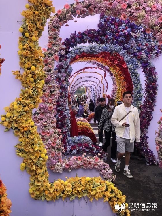 据介绍,打卡点以女性头部轮廓为主体形象,目光与高原明珠滇池、西山睡美人遥遥相望。采用7个颜色大类,康乃馨、绣球、红掌等12种品类、共计8万余朵鲜切花拼凑而成24道花门,共同连成“女王大道”。打卡点与地段环境相融合,游客穿梭“女王大道”,感受春城花都之美。
