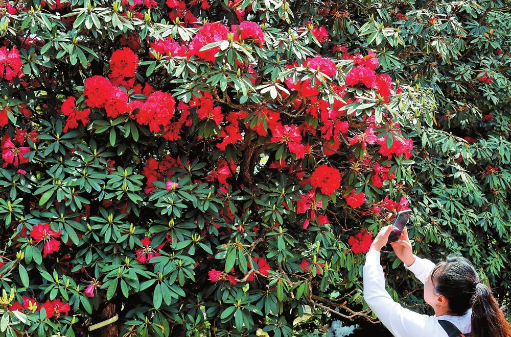 游人在金殿名胜区杜鹃园赏花。