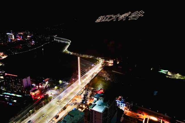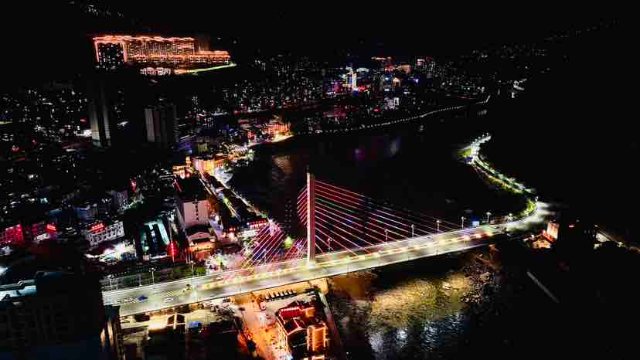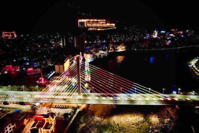怒江通达桥似一个明眸顾盼的仙女,由江西生态走廊、江东交通环线灯光形成两袖彩带,不但衬托出两侧青山的巍峨,也展现了泸水新城区的独特魅力。