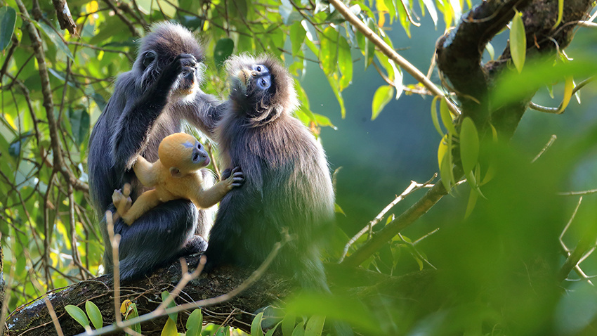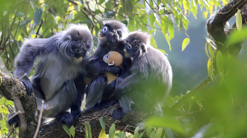 菲氏叶猴宝宝和“家长”在一起。(郑山河 摄)