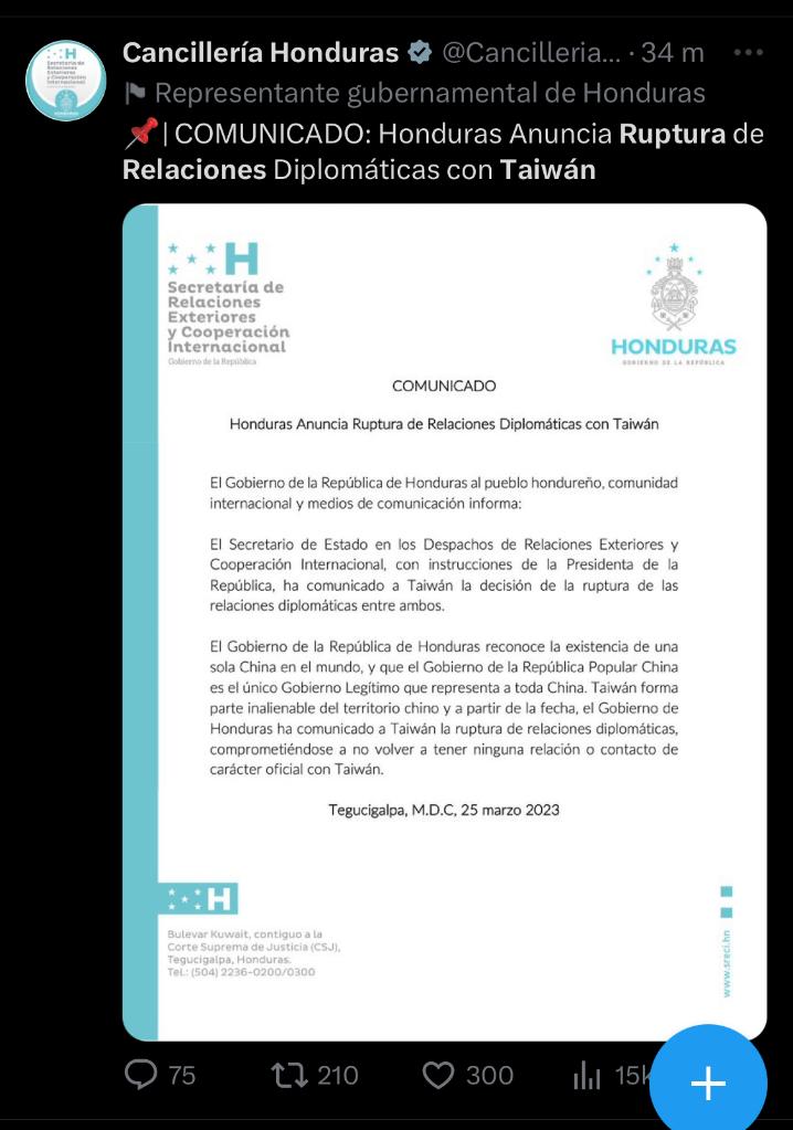 新华社特古西加尔巴3月26日电 洪都拉斯外交部当地时间25日下午发布声明,宣布与台湾断绝所谓“外交关系”。北京时间3月26日,中国和洪都拉斯建交。