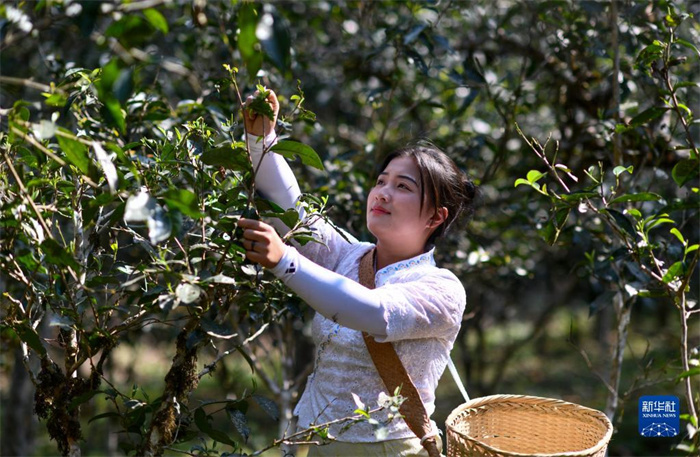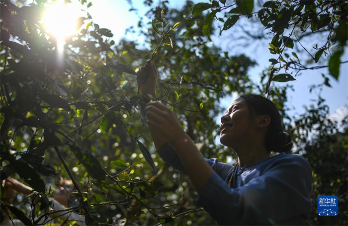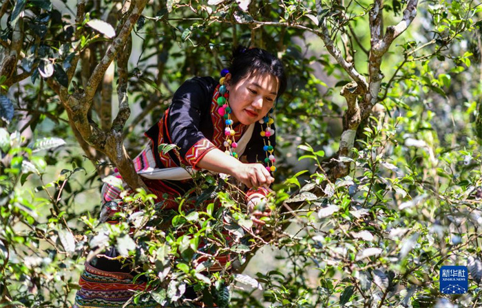 3月25日,景迈山茶农张小莉在古茶林里采茶。