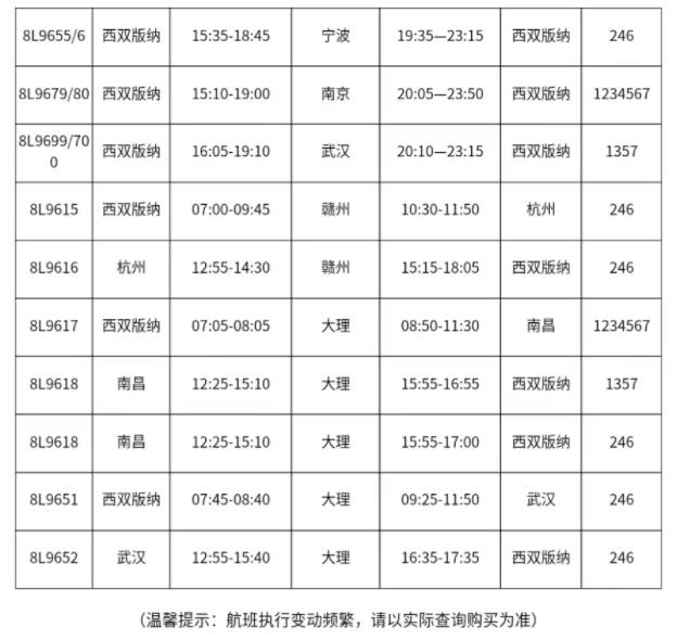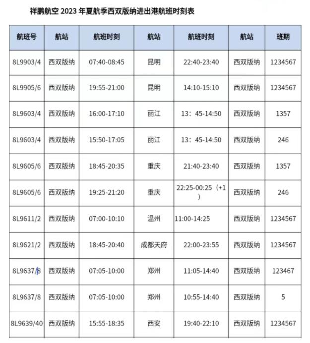 据了解,祥鹏航空在夏航季开通了多条直通西双版纳的省内外航线,销售价格400元起,助力游客便捷出行。同时,为便利沪丽两地往来互通,祥鹏航空计划于2023年4月10日开通丽江直飞上海浦东航线,周一至周日每天执飞1班,去程丽江起飞时间为16:35,到达上海浦东时间为20:10,返程时间为21:25,到达丽江的时间为次日凌晨01:00。具体航班信息、价格以实际查询为准。(春城晚报-开屏新闻 记者孙江荭 通讯员李思婷 祥鹏航空供图)