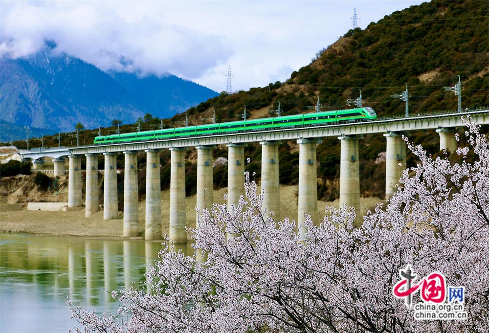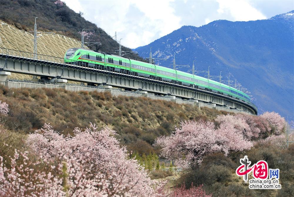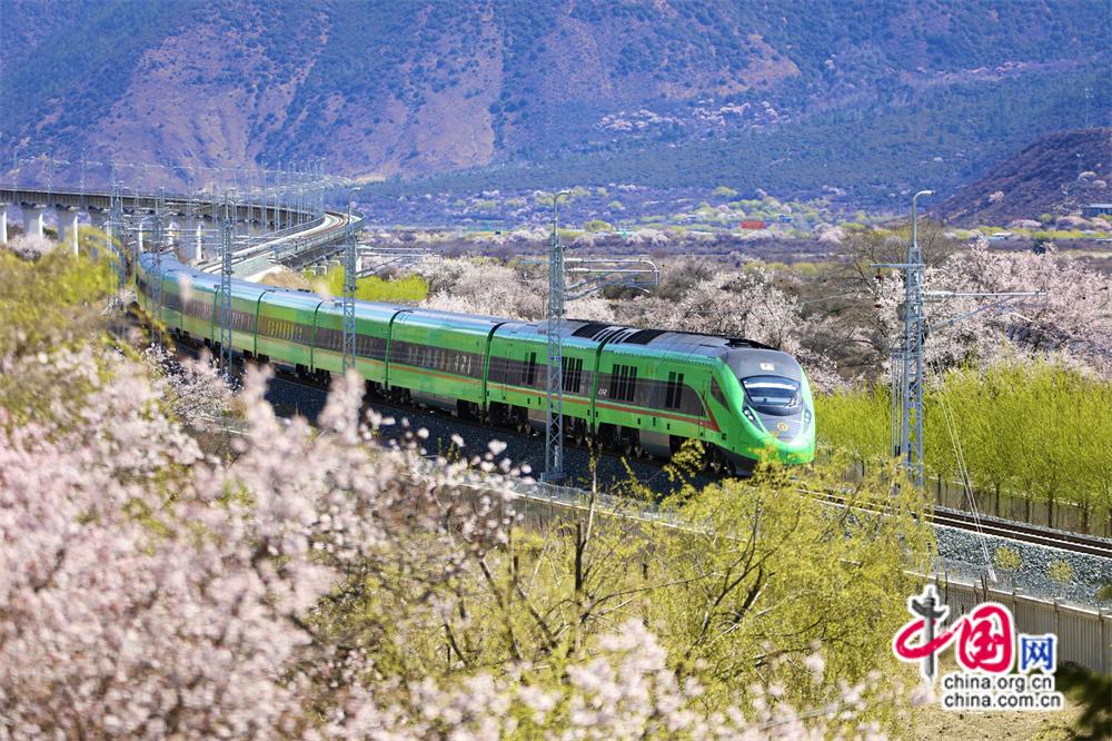 穿梭在桃花林中的拉林铁路高原复兴号。马生明摄