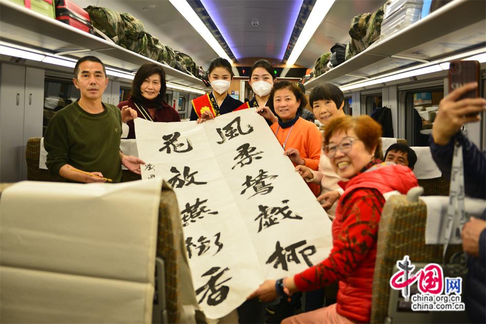 青藏集团公司文艺骨干为旅客送上书法作品。 郝宝君摄