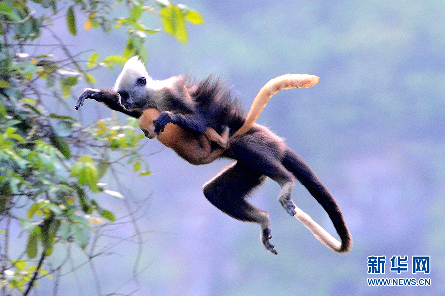 春暖花开,在广西崇左白头叶猴国家级自然保护区,“石山精灵”白头叶猴带着呆萌的猴宝宝,在崖壁和林间攀爬、跳跃、觅食,画面温情又可爱。