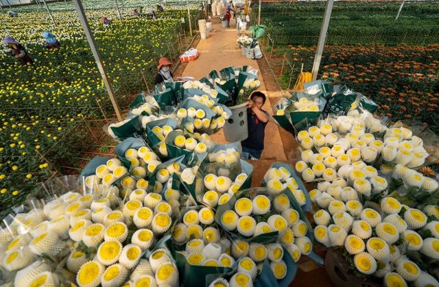 工作人员准备将包装好的鲜花运送到仓库