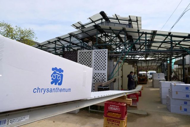 在日本埼玉县北葛饰郡,小西武将当日到货的中国云南进口鲜花卖给一家鲜花加工厂。