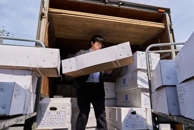 在日本东京板桥花卉市场,经营花卉公司的小西武将当日到货的中国云南进口鲜花发送给一家下游经销商。