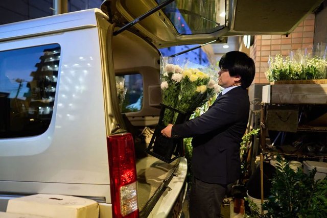 在日本千叶县千叶市,小西武将从中国云南进口的鲜花送到订货的花店。