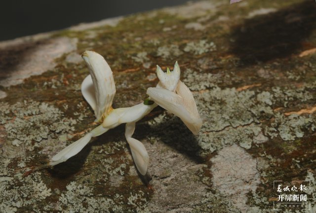 据了解,兰花螳螂学名为冕花螳,体色主要为白色,带有粉红色或黄色的点缀,类似于一些兰花和其他花朵,独特的形态和颜色让兰花螳螂不仅能成功吸引传粉昆虫进行捕食,还让其成为了昆虫界的颜值担当。(开屏新闻 记者杨质高 通讯员陶平 高雪 马丽芳 陶平)