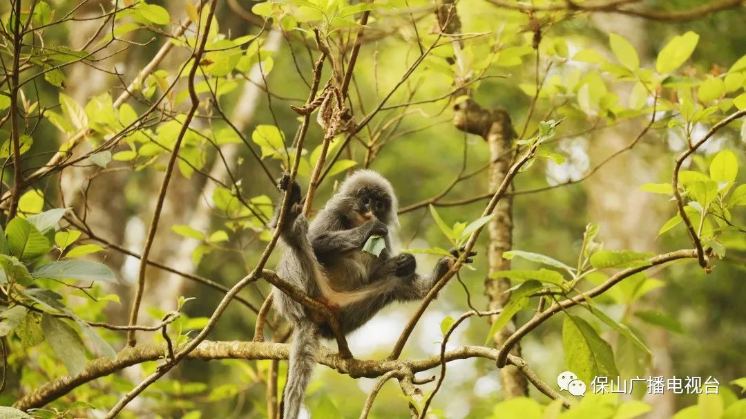 画面中,身手敏捷的菲氏叶猴,有的坐在土坎旁的树根上,食土补充盐等微量元素,有的攀附在树枝上,采食着枝头的新芽嫩叶……大猴小猴食态各异,享受大自然赐予的美餐。