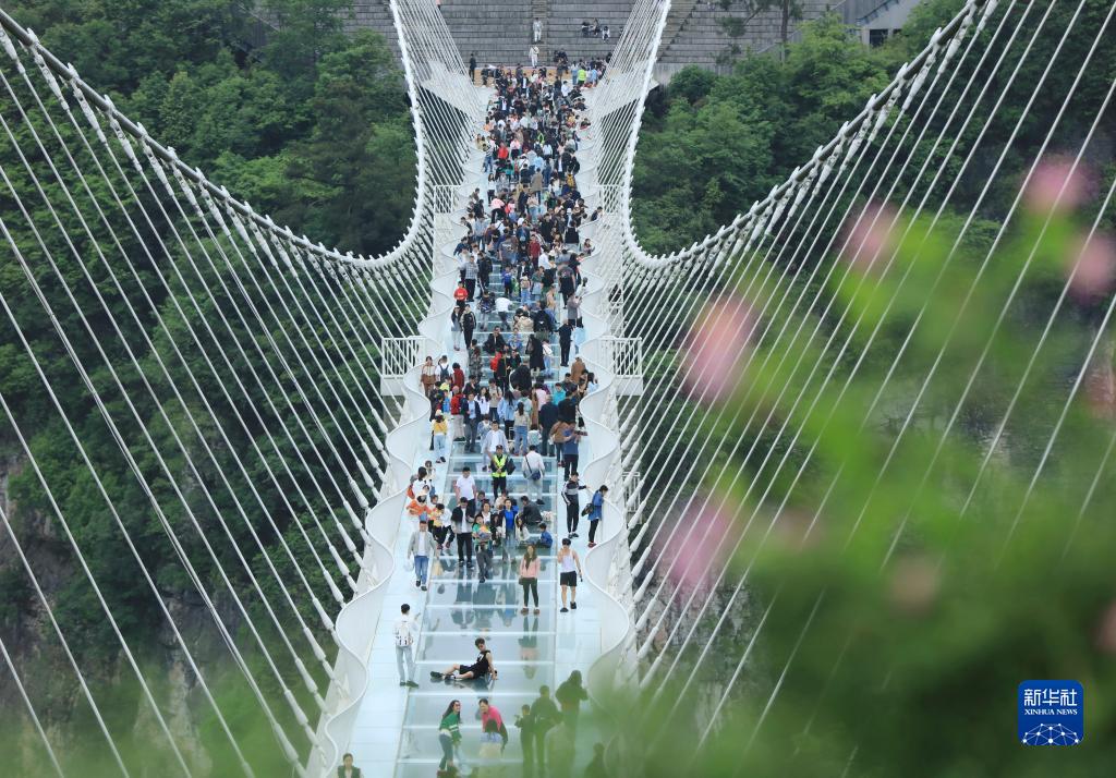 5月2日,游人在湖南张家界大峡谷风景区体验高空玻璃桥。新华社发(吴勇兵 摄)