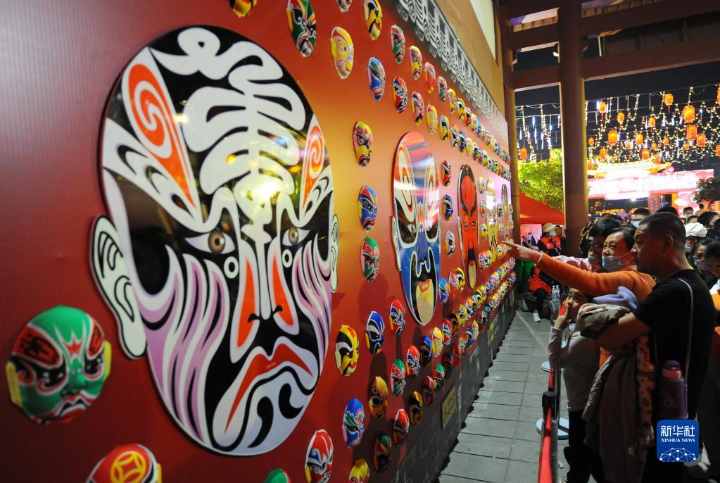 4月30日,游客在山东省滕州市“黄河大集·龙泉庙会”上观赏京剧脸谱。新华社发(李志军 摄)