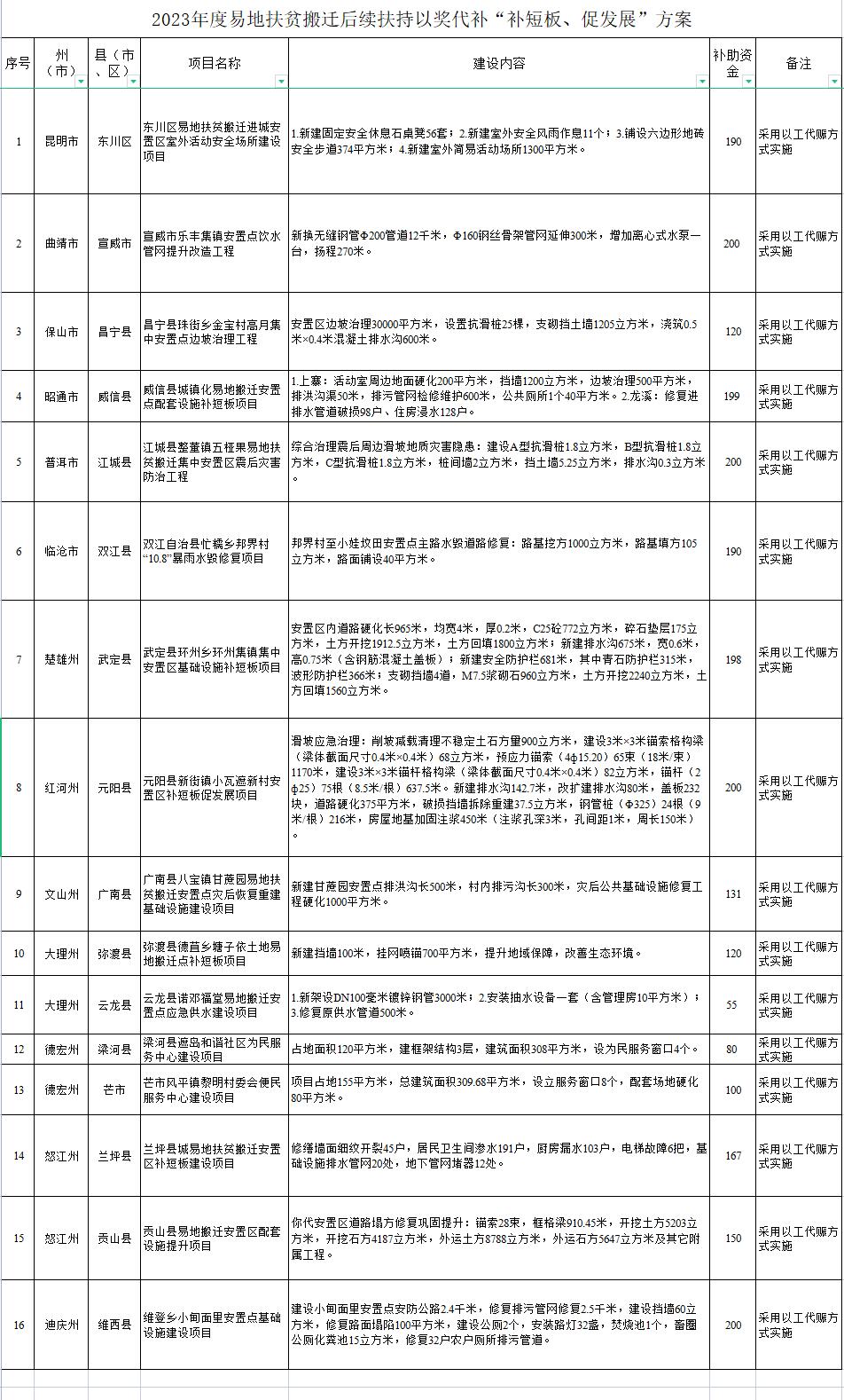根据2023年度易地扶贫搬迁后续扶持以奖代补方案,此次奖补项目包含就业帮扶、产业发展、社区服务管理示范安置区奖励资金2500万元;“补短板、促发展”项目补助资金2500万元。其中,对昭通市昭阳区红路二期安置点、昭通市镇雄县高山村大地安置点等18个就业帮扶示范安置区奖励资金1000万元;对丽江市宁蒗县易地扶贫搬迁进城安置区、曲靖市会泽县以礼街道河滨、清水碾安置区等9个产业发展示范安置区奖励资金1000万元;对昆明市禄劝县皎平渡镇杉乐村杉乐安置区、昭通市鲁甸县砚池街道卯家湾安置区景新社区等18个社区服务管理示范安置区奖励资金500万元;对昆明市东川区进城集中安置区、曲靖市宣威市乐丰集镇安置点等16个安置区“补短板、促发展”项目补助资金2500万元。奖补资金主要用于安置点发展农业特色优势产业、建设扶贫车间和解决搬迁群众“急难愁盼”问题等,以发挥示范引领作用。