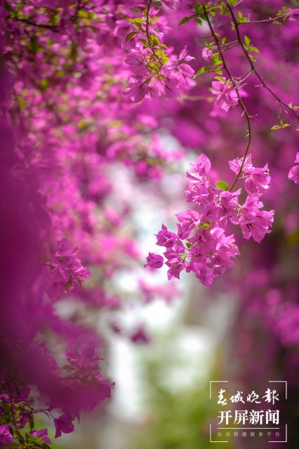 这里的三角梅除了开出一帘高空瀑布,它还沿着一层的围墙开出了一个“花拱桥”,站在一楼拍照就很出片,爬上楼层也很容易以花为背景,随便一件白衬衫、白T恤都能拍出明媚又浪漫的美照。