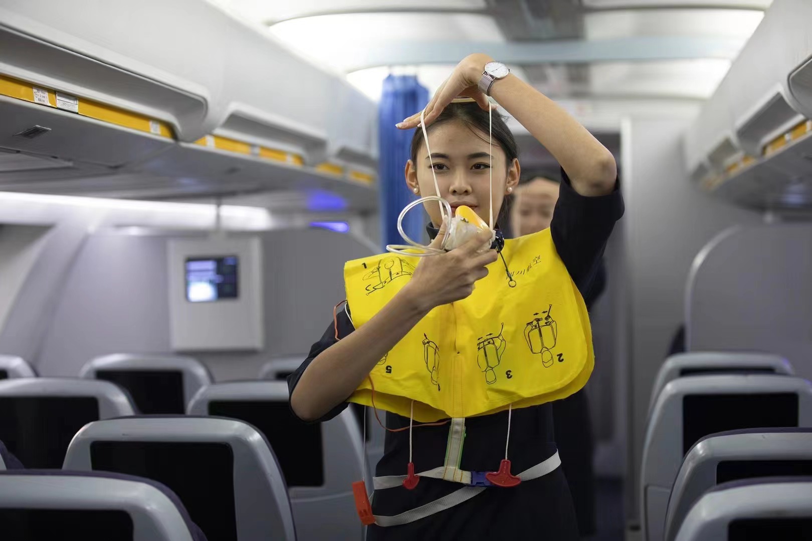实训中心负责人刘婷介绍登机流程。记者孟祝斌/摄