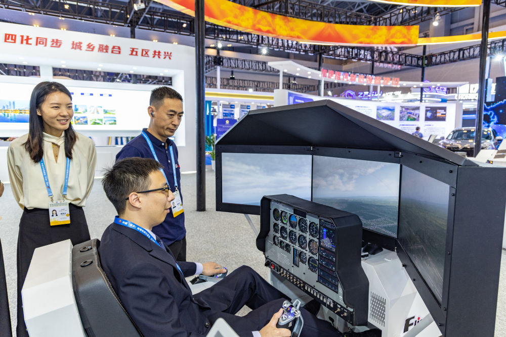 在“西洽会”四川馆内,观众在体验科普级飞行模拟体验舱。新华社记者黄伟 摄
