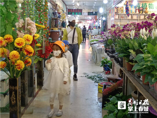 5月22日上午,前来岔街1号花卉市场的顾客不多,有的店主快到中午还没有开张。市场内,有的店主在整理鲜花,有的在直播带货,还有的在刷着视频打发时间。看到有顾客从店门前经过,店主都会热情招呼道:“老板,需要什么花,现在买玫瑰最划算。”