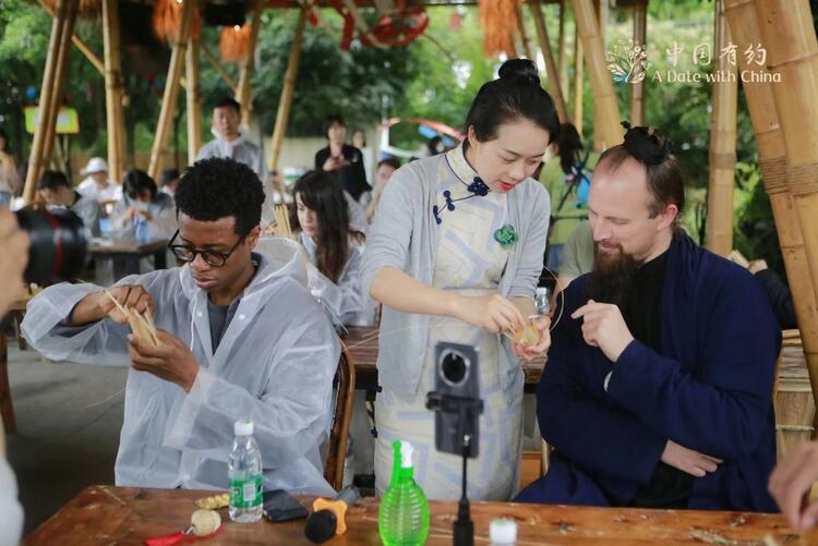 道明镇竹编技艺传承人杨隆梅在指导外国友人制作竹编(主办方供图)
