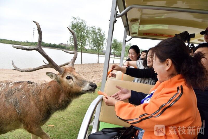“看!有只麋鹿过来啦!”5月24日下午,一辆满载着游客的观光游览车开进江苏大丰麋鹿国家级自然保护区,寻找麋鹿的踪影。突然,路边一只成年麋鹿向大家走过来,大方接过游客们投喂的胡萝卜咀嚼起来。