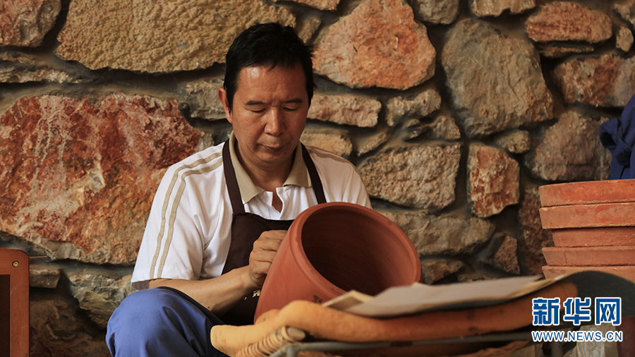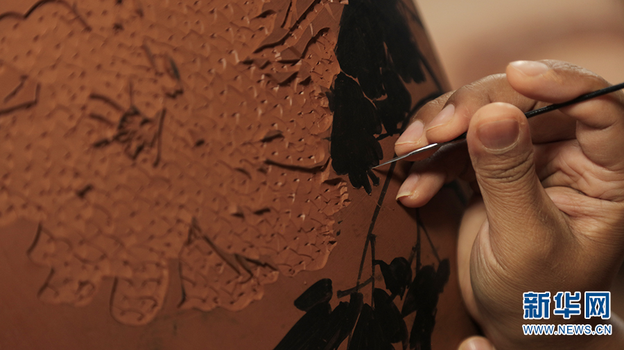 建水紫陶艺人在对陶坯进行装饰。(摄于4月20日)。新华网 范芳钰 摄