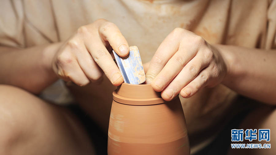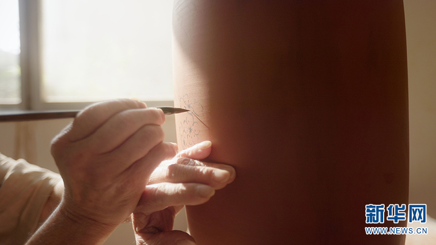 在陶坯上雕刻(摄于4月21日)。新华网 范芳钰 摄